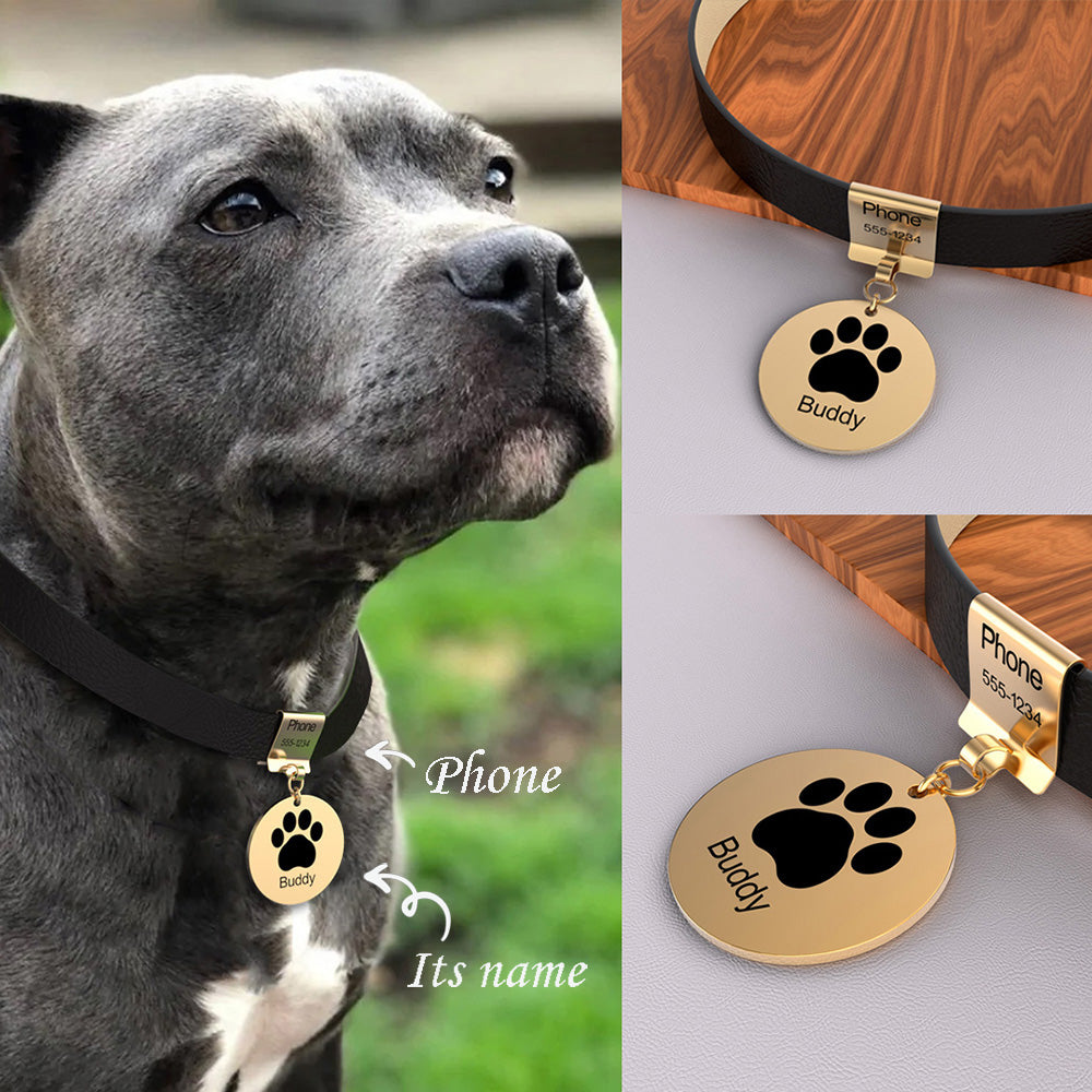 Pet Leather Collar With Custom Name & Phone Number Footprint Pendant